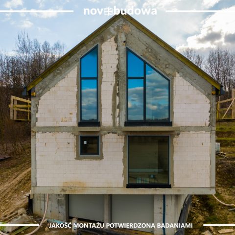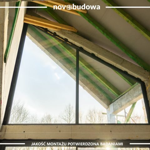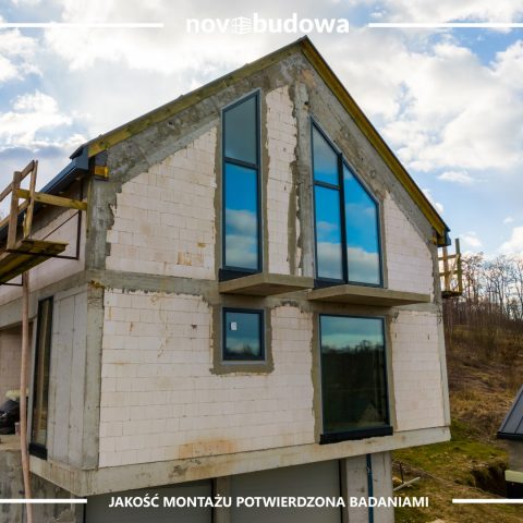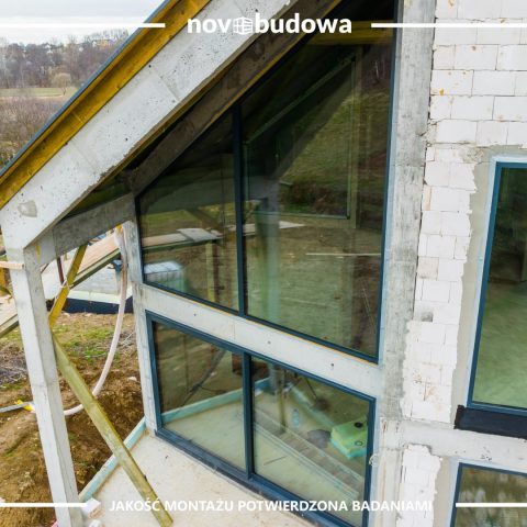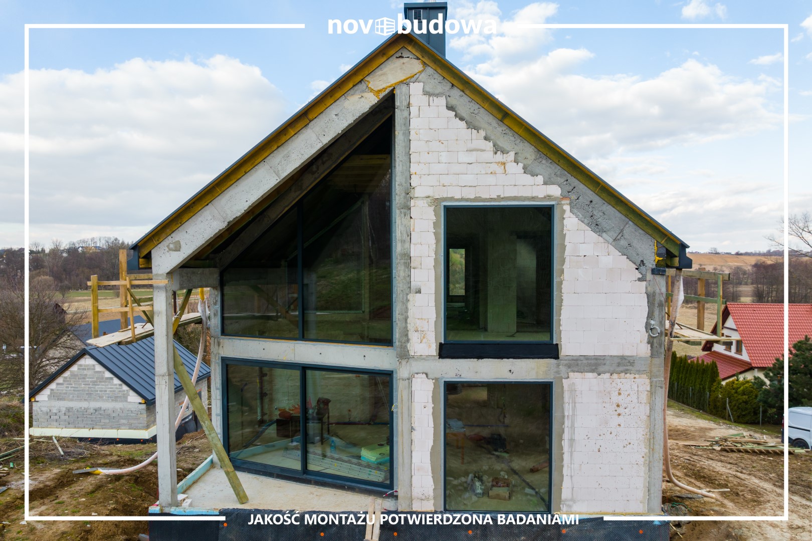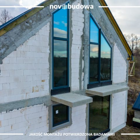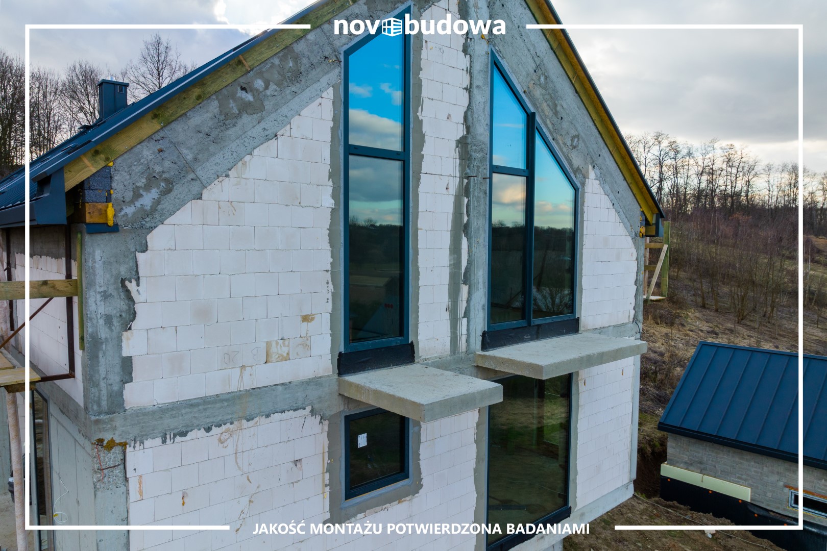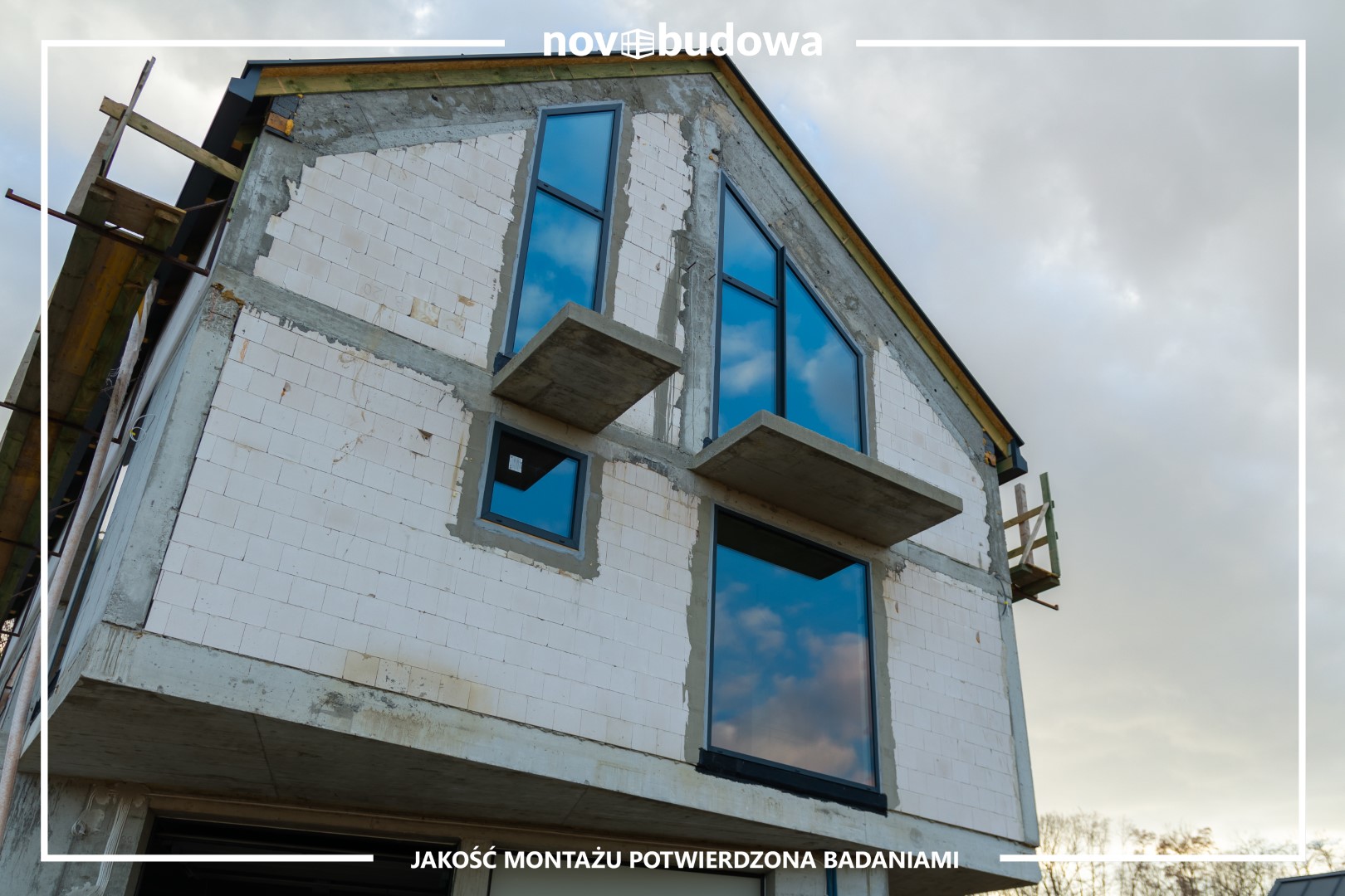 W tej realizacji zamontowaliśmy wielkogabarytowe przeszklenia oraz skośne okna, które dodają domu swoisty urok i charakter. Niekonwencjonalne ułożenie asymetrycznych okien przyciąga uwagę i sprawia, że dom staje się niepowtarzalny wśród innych budynków.