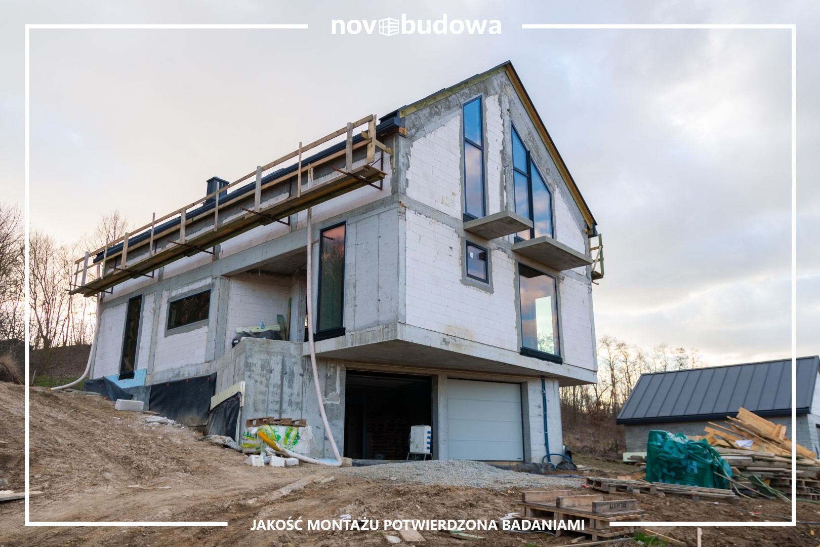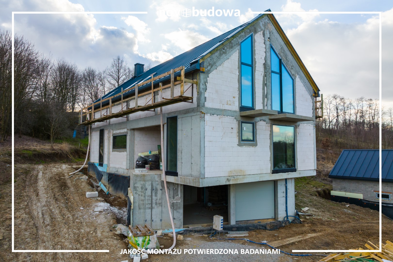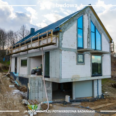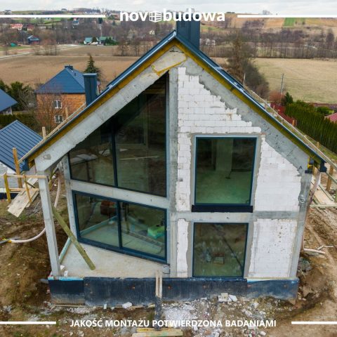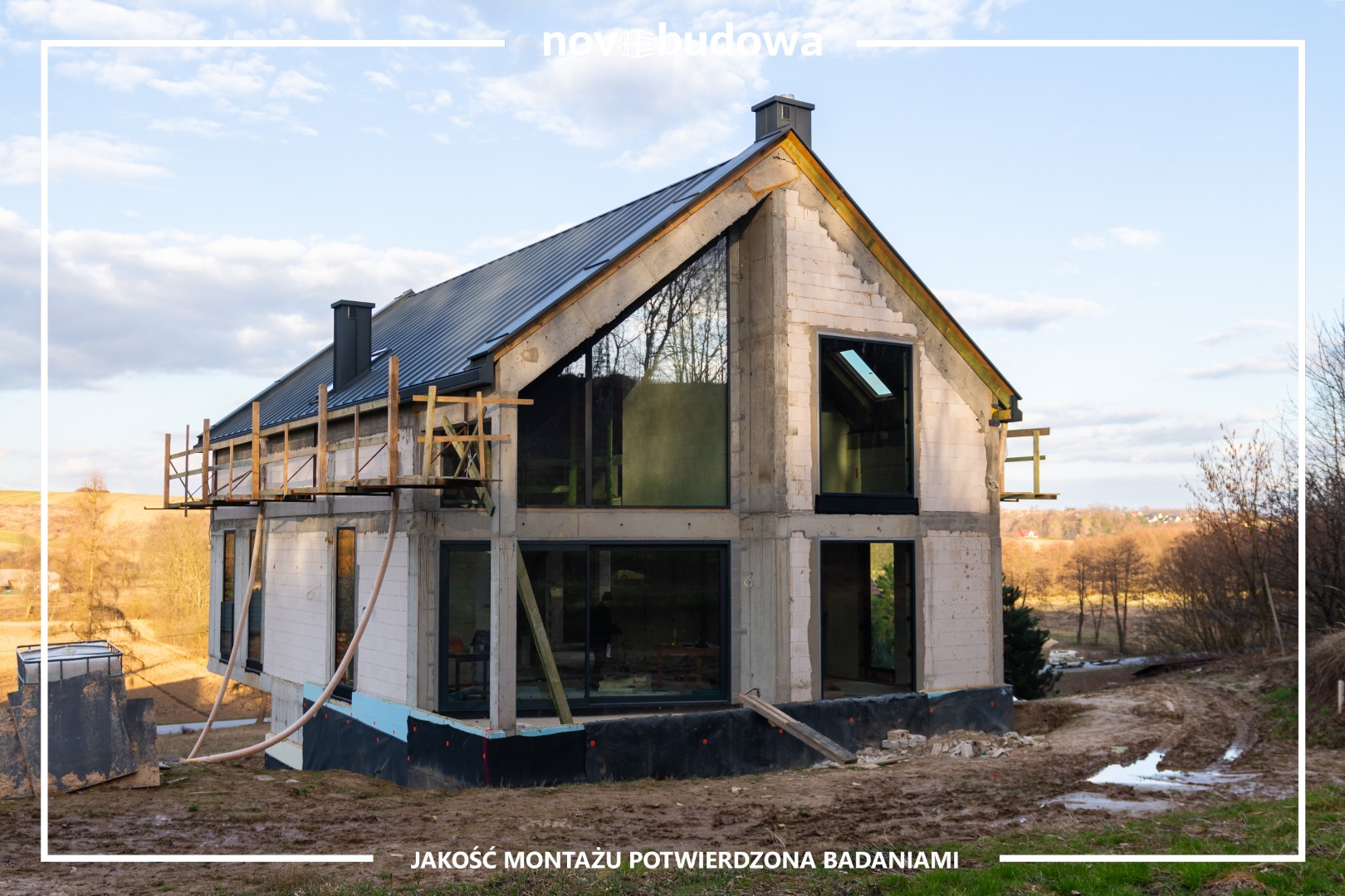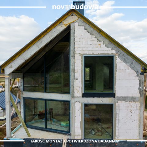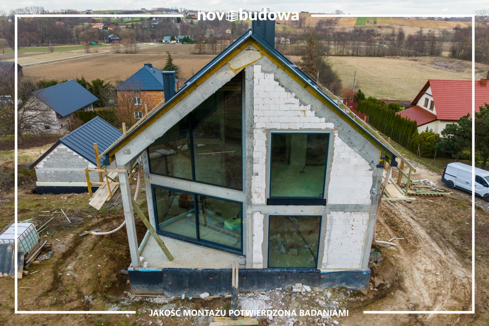 W tej realizacji zamontowaliśmy wielkogabarytowe przeszklenia oraz skośne okna, które dodają domu swoisty urok i charakter. Niekonwencjonalne ułożenie asymetrycznych okien przyciąga uwagę i sprawia, że dom staje się niepowtarzalny wśród innych budynków.