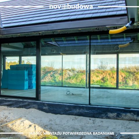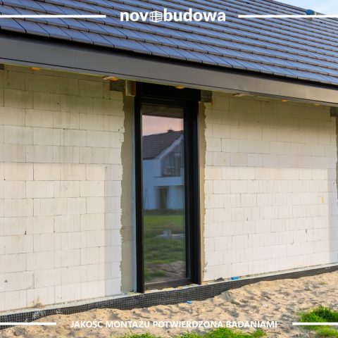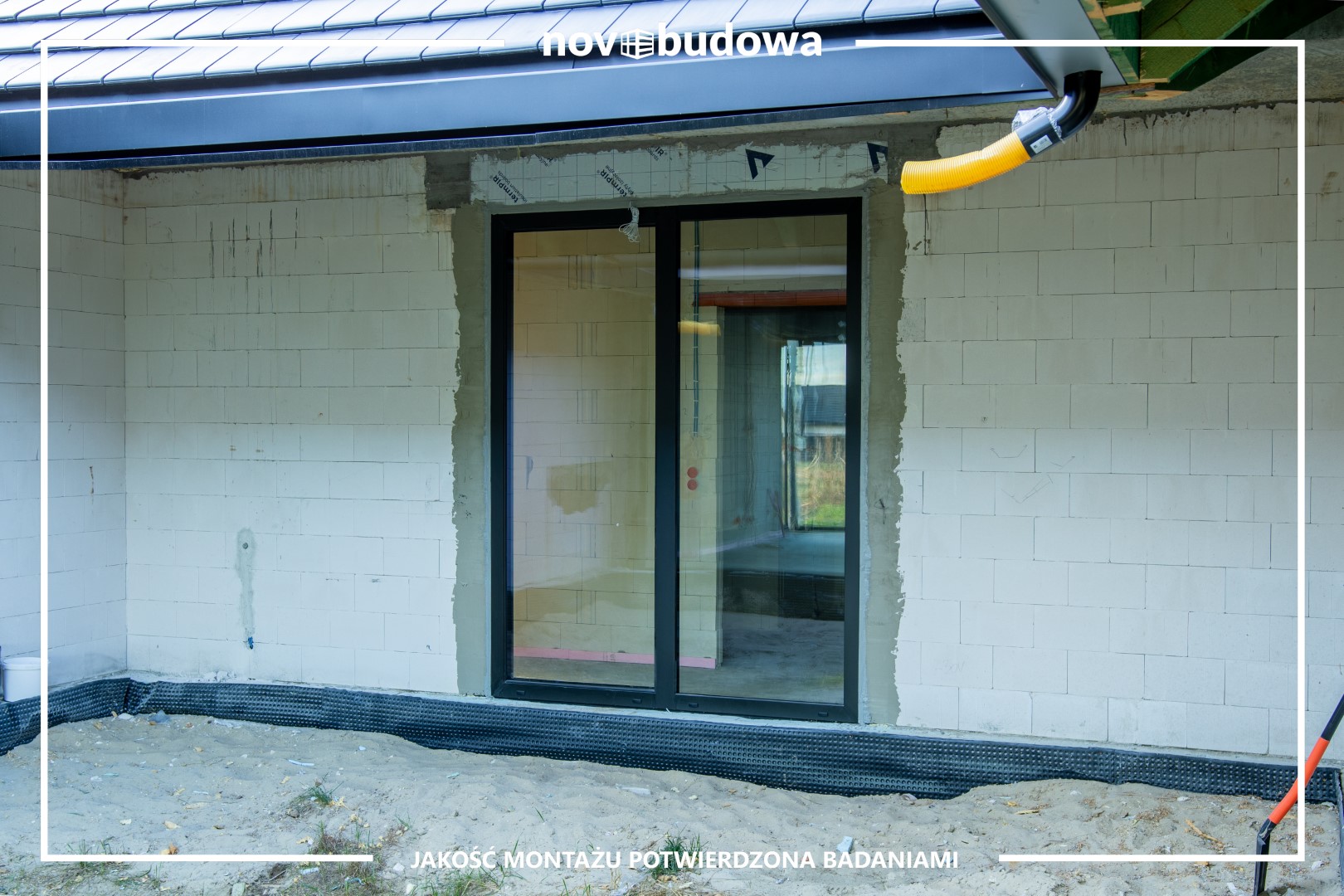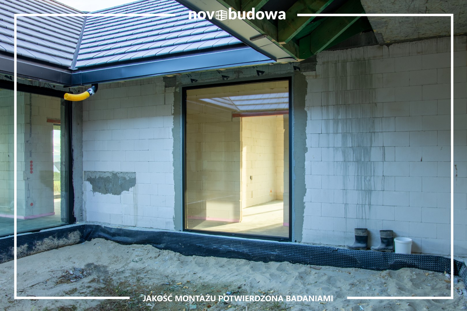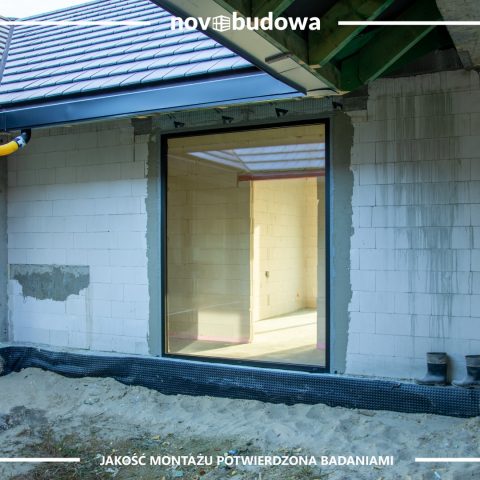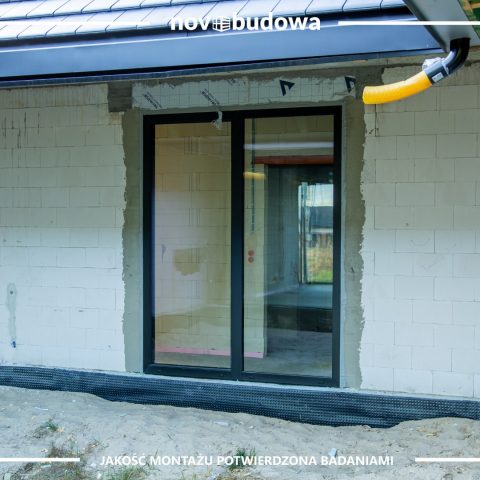 Ciągi okienne ze względu na konieczność ominięcia słupów konstrukcyjnych montowane w warstwie ocieplenia, pozostała stolarka usytuowana w licu zewnętrznym i uszczelniona z wykorzystaniem Illbruck SP925 od wewnątrz, Soudal Soudatight Hybrid od zewnątrz, środek pianka PUR, dołem EPDM, wszędzie podwaliny purenitowe – standard