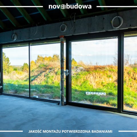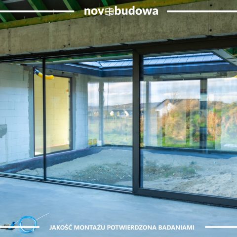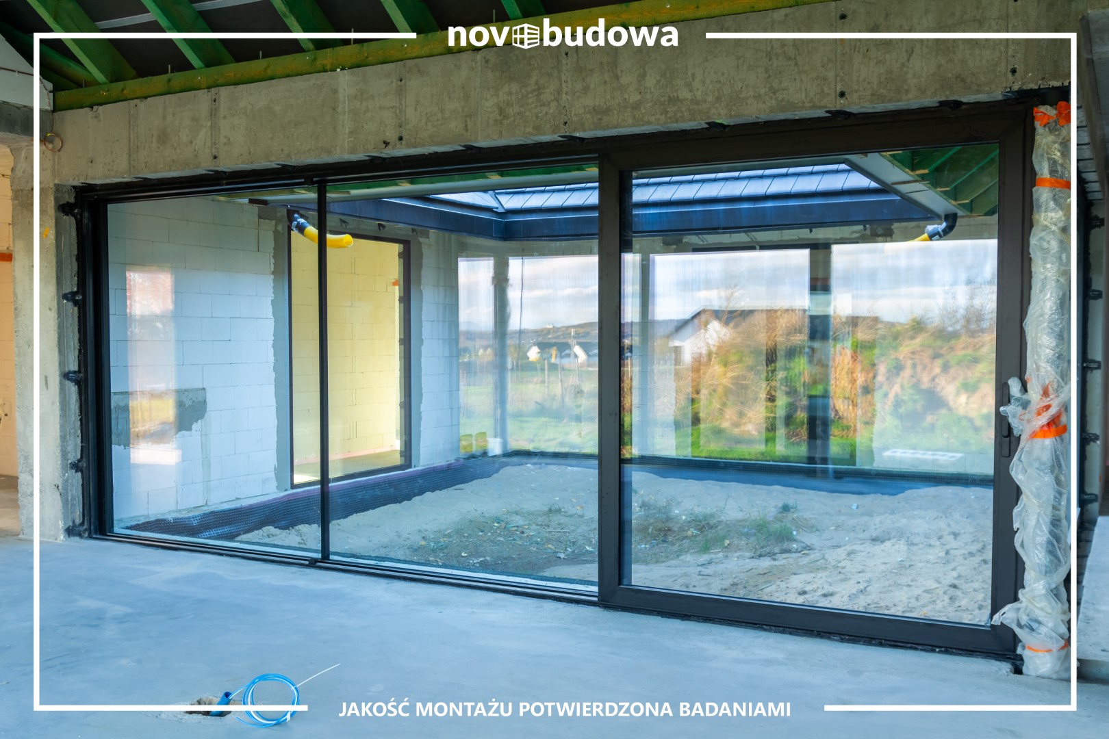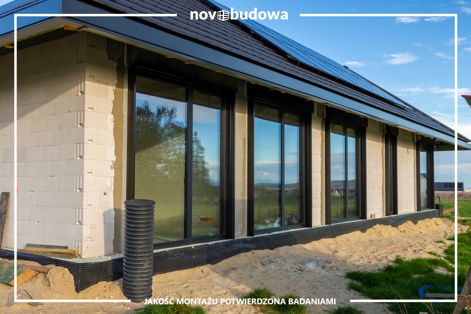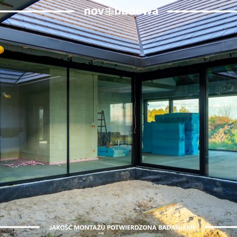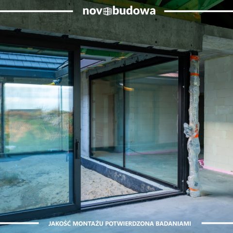 Ciągi okienne ze względu na konieczność ominięcia słupów konstrukcyjnych montowane w warstwie ocieplenia, pozostała stolarka usytuowana w licu zewnętrznym i uszczelniona z wykorzystaniem Illbruck SP925 od wewnątrz, Soudal Soudatight Hybrid od zewnątrz, środek pianka PUR, dołem EPDM, wszędzie podwaliny purenitowe – standard