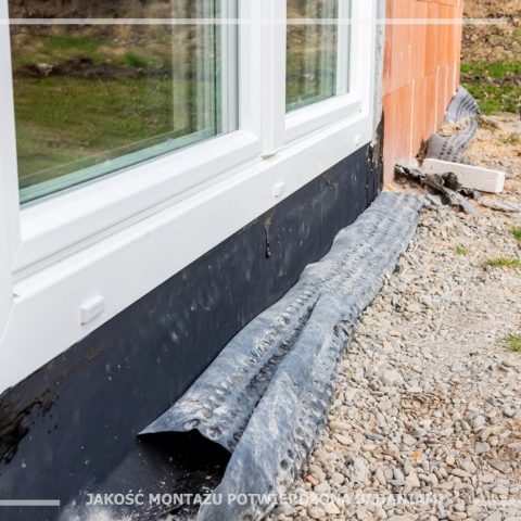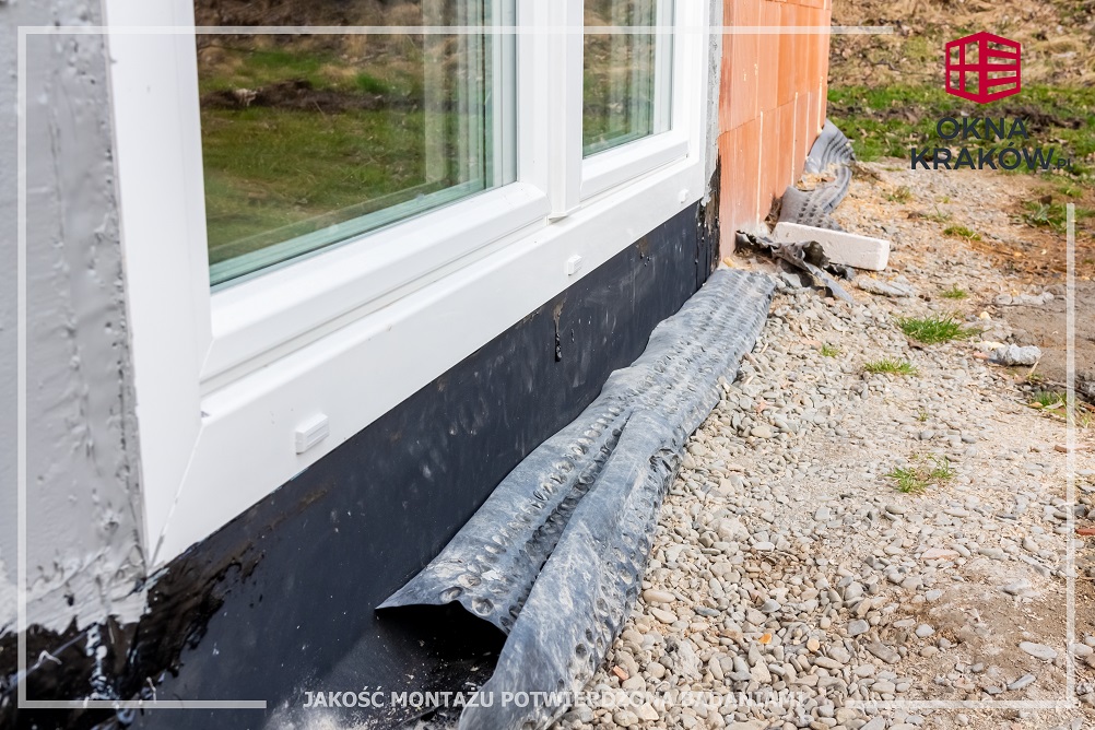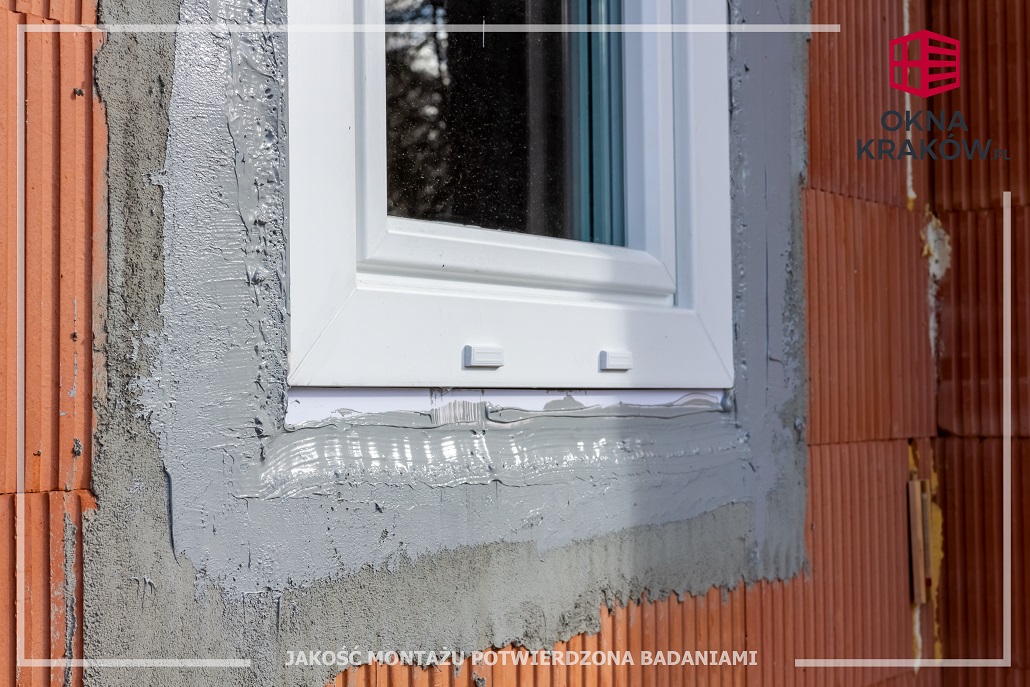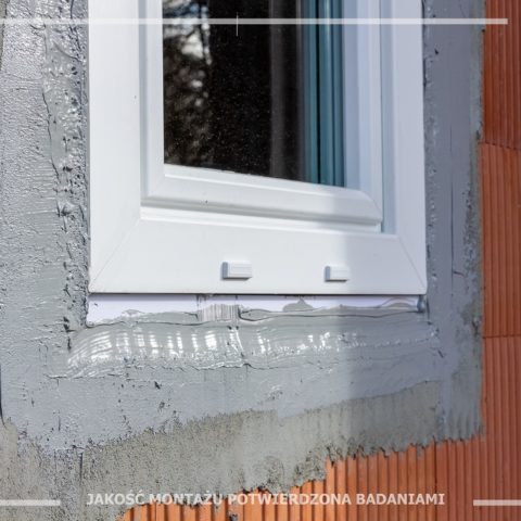 Prawidłowy szczelny montaż w licu muru z wykorzystaniem folli paroszczelnej w płynie Illbruck SP925 oraz zewnętrznej i paroprzepuszczalnej powłoki uszczelniającej SOUDAL SoudaTight Hybrid. Pod wszystkimi konstrukcjami zastosowano podwaliny i listwy purenitowe, w części progowej okien balkonowych wykonano uszczelnienie hydroizolacyjne EPDM. Mocowanie mechaniczne za pomocą kotew stalowych, śrub ramowych oraz szyn perforowanych V dedykowanych do montażu w pustakach ceramicznych.