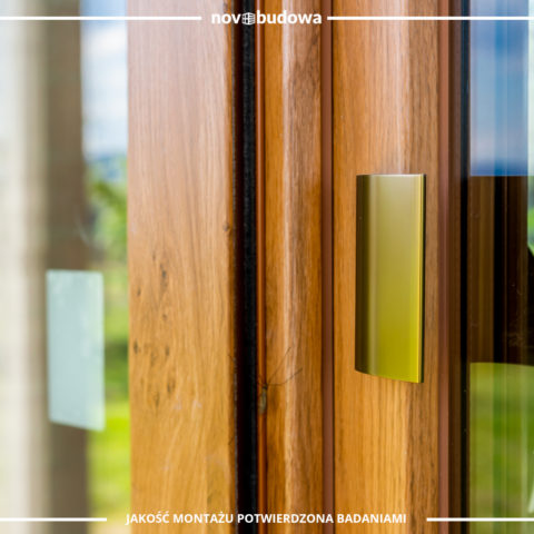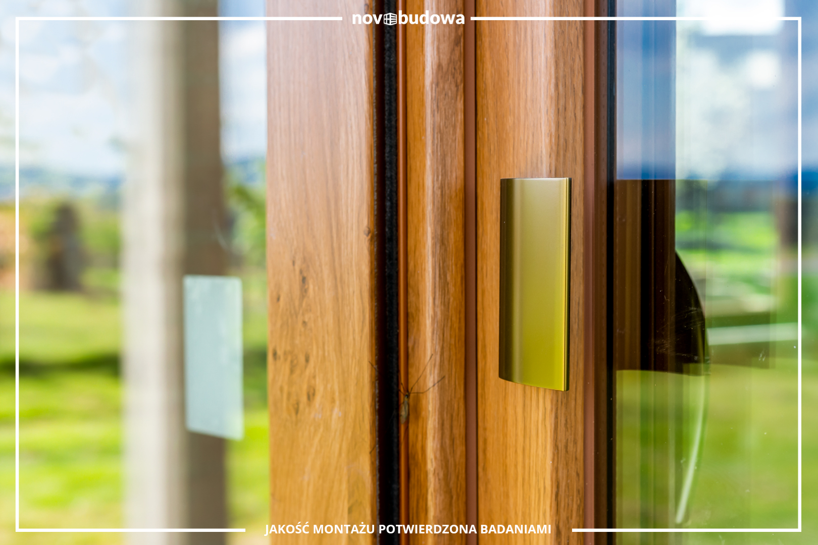 Okna PVC TEAM BALANCE 82MD w obustronnym kolorze Winchester, z dwukomorowymi pakietami szybowymi i ciepłymi ramkami dopasowanymi kolorystycznie do okleiny. Stolarka posiada okucia z niewidocznymi zawiasami ROTO DESIGNIO II. W całym domu zastosowane zostało kilkanaście okien tradycyjnych, duża witryna w jadalni zapewniająca możliwie jak największe przeszklenie oraz drzwi balkonowe. W kuchni zastosowano zestaw narożny połączony słupkiem.