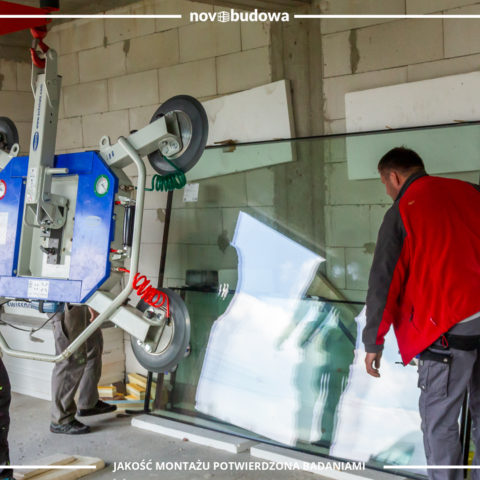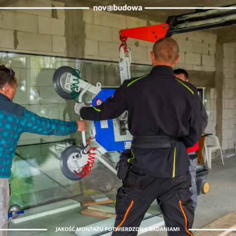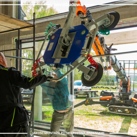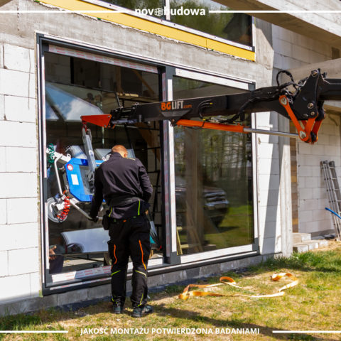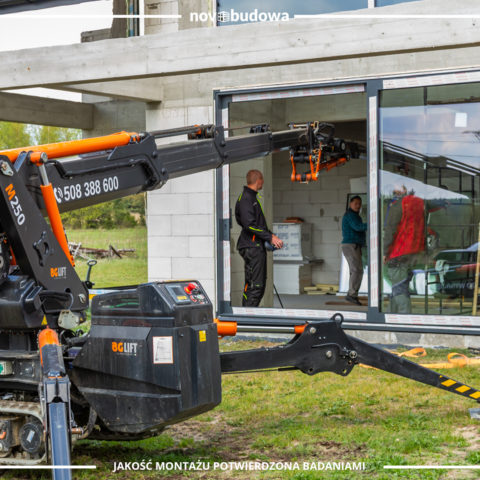 Montaż mechaniczny z wykorzystaniem kątowników montażowych, kotew systemowych, śrub ramowych oraz szyn perforowanych typu V. Transport i montaż ciężkich konstrukcji z wykorzystaniem mini-żurawia BG LIFT M250, który przy tej budowie miał trochę pracy 😉