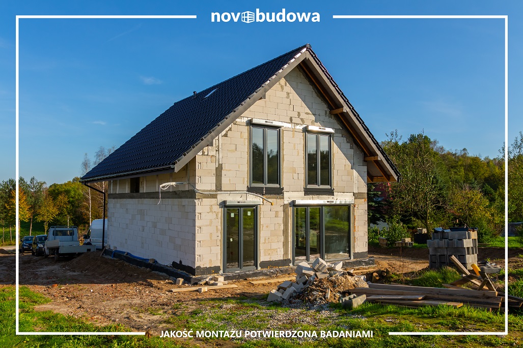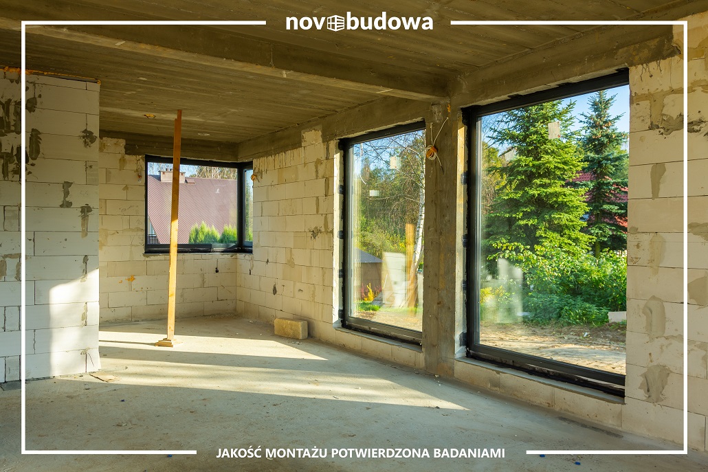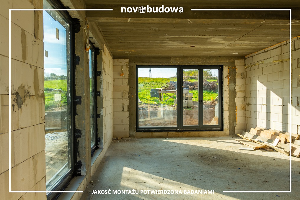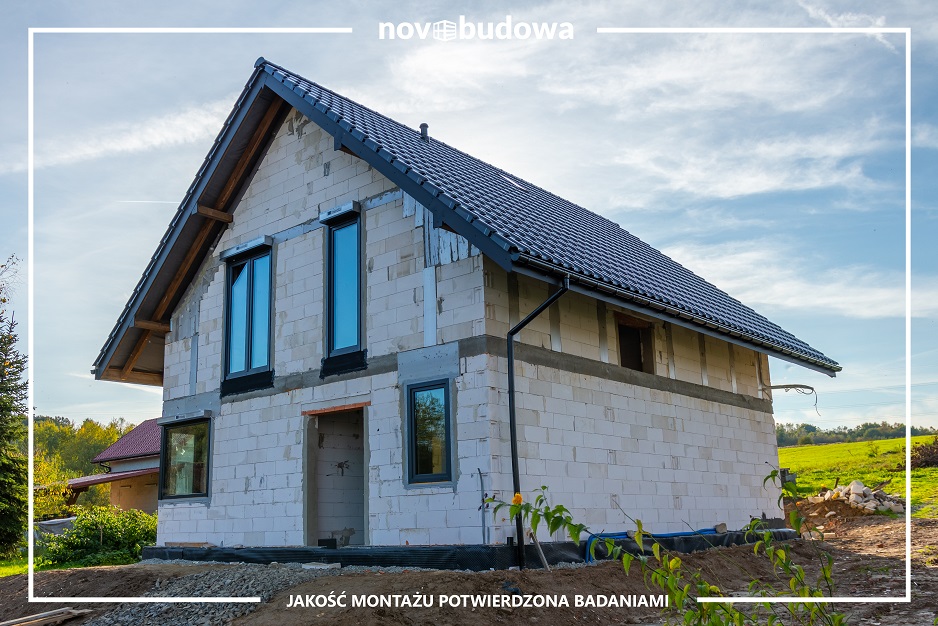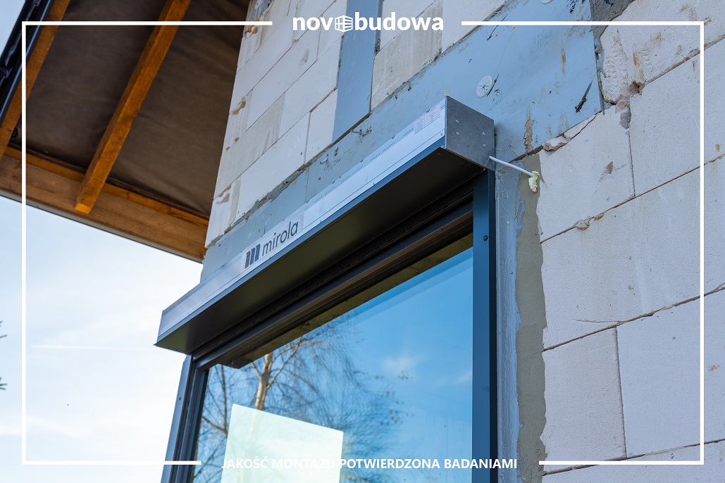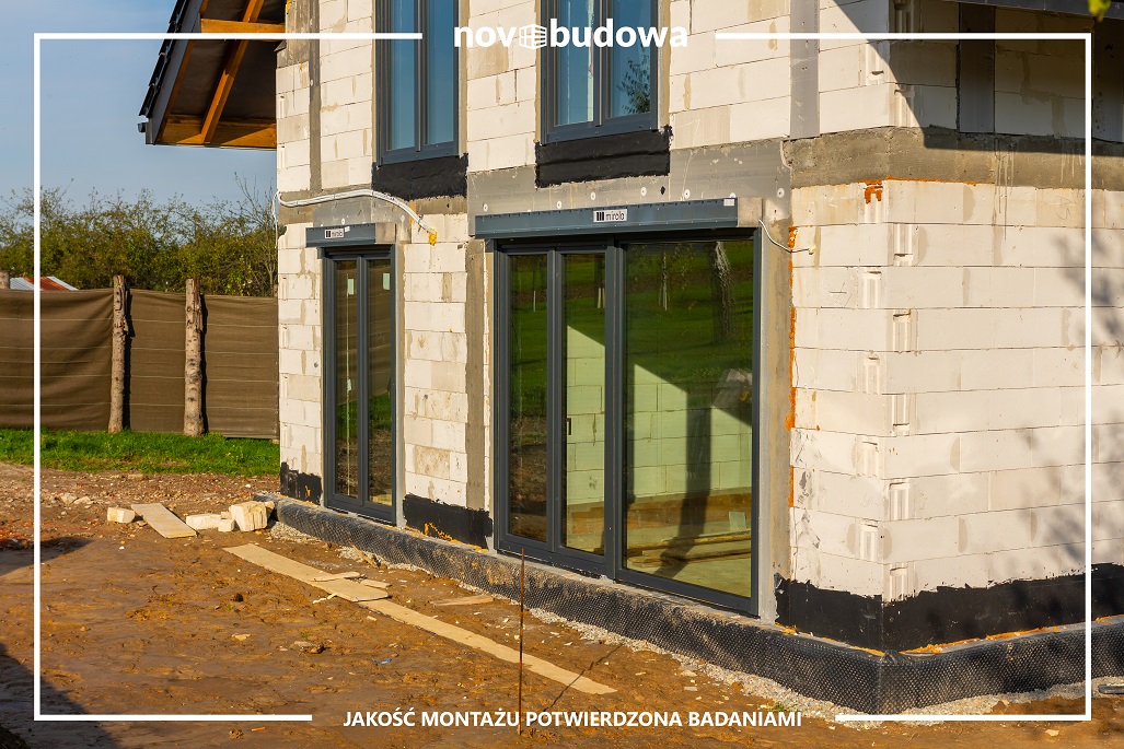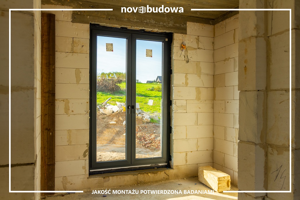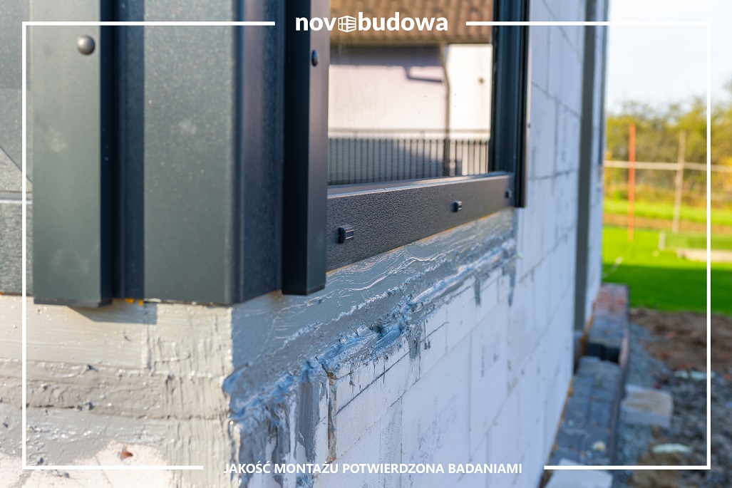 Prawidłowy montaż warstwowy z wykorzystaniem mas uszczelniających w płynie – Soudal SoudaTight Hybrid oraz Illbruck SP925. Podwaliny purenitowe zostały wykorzystanie jako podparcie dolne wszystkich okien. Montaż mechaniczny z wykorzystaniem kątowników montażowych, kotew montażowych oraz wkrętów ościeżnicowych. Dodatkowo prawidłowe uszczelnienie łączników statyczno-dylatacyjnych oraz kątowych przy pomocy taśm rozprężnych.