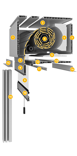 Pancerz rolety rolowany jest na wał nawojowy, który może być napędzany ręcznie lub za pomocą rurowego silnika elektrycznego. Wał napędowy obudowany jest plastikową skrzynką przygotowaną do obłożenia dowolnym materiałem wykończeniowym.